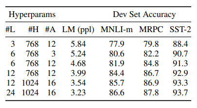 위 그림은 모델 size에 따른 성능 실험표이다. L = 레이어의 수, H = hidden size, A = attention head의 수를 나타낸다. 모델의 사이즈가 클수록 fine-tuned 성능과 pre-training 모두 결과가 더 우수한 것을 확인할 수 있다.
