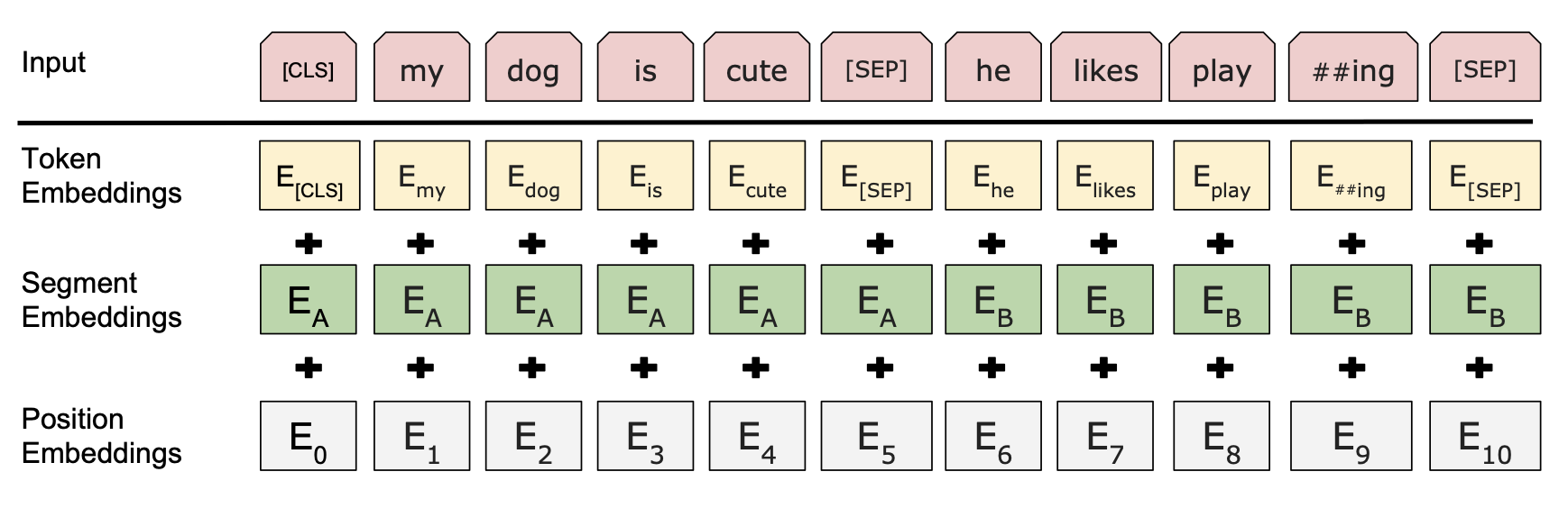 Input representation은 Token Embeddings(WordPiece Embeddings), Segment Embeddings, 그리고 Position Embedding의 합이다.