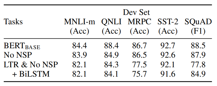 BERT의 NSP와 MLM의 효과를 실험한다. BERT-base 모델과 동일한 파라미터를 가진 모델을 NSP task를 제거한 버전과 LTR(left-to-right) & no NSP 버전으로 학습시켜 실험시킨 결과는 다음 표와 같다.
