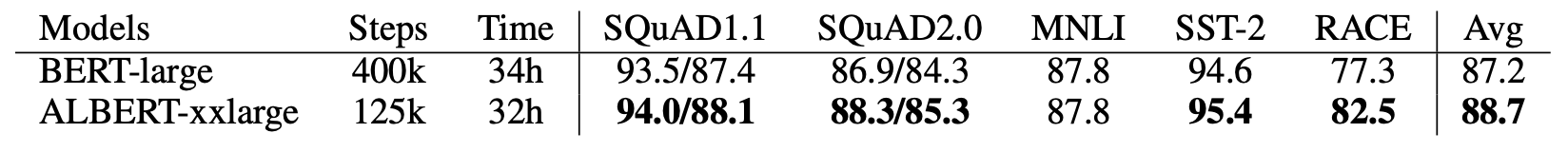 ALBERT-xxlarge는 BERT-large 모델의 확장된 버전인데, 그만큼 학습 시간이 3배 정도 느리다. 원래 오래 학습할수록 모델의 정확도가 높아지기 때문에, 두 개의 모델을 같은 시간동안 학습할 경우 얼만큼의 성능을 보이는지 실험한 결과가 위의 표이다. 학습 속도가 3배 느린 ALBERT-xxlarge가 같은 시간동안 학습되었는데도 불구하고 BERT-large보다 뛰어난 결과를 보여준다!