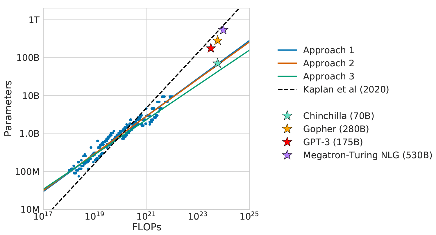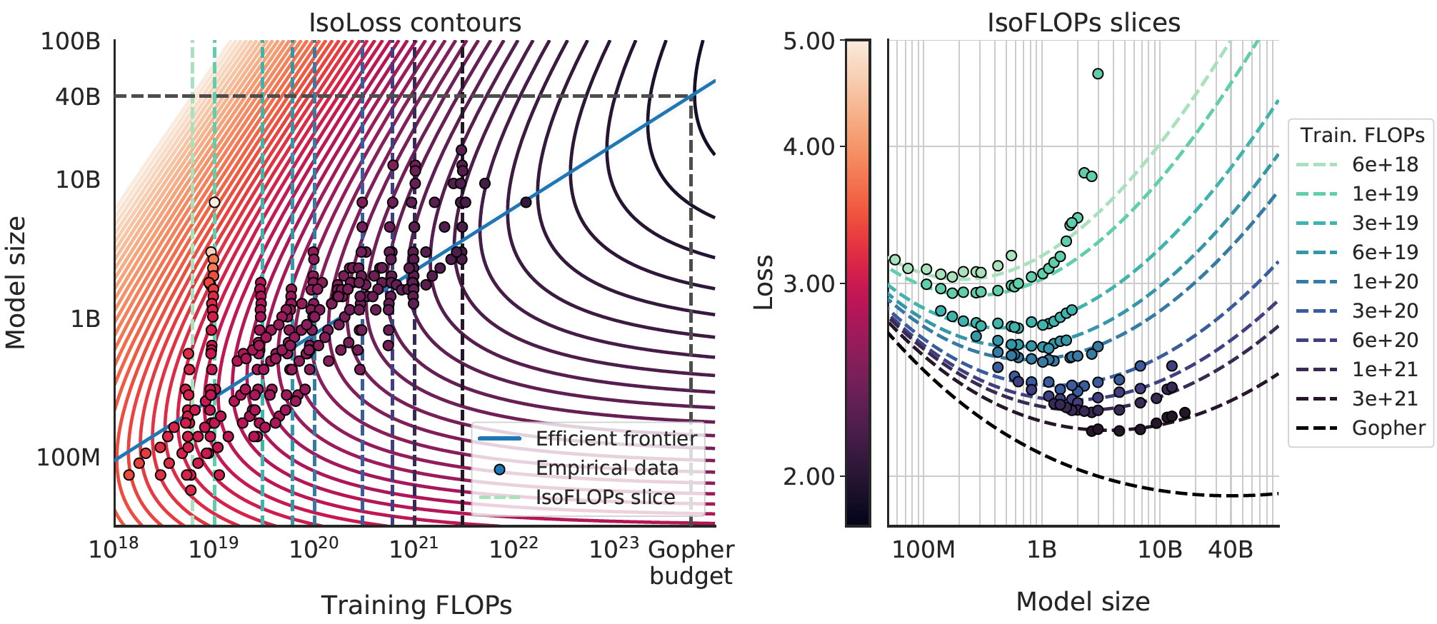 위 그래프에서 검은색 점선의 그래프는 기존의 scaling-law를 나타내고 있고, 나머지 실선은 논문에서 제시된 최적의 scaling-law이다. 이전의 scaling-law가 모델의 파라미터 수를 증가시키는 것에 치중되었던 반면에, 실선 그래프를 보면 FLOPs가 증가함에 따라 파라미터 수와 학습 데이터의 크기가 거의 동등하게 증가하는 것이 최적임을 보여준다.