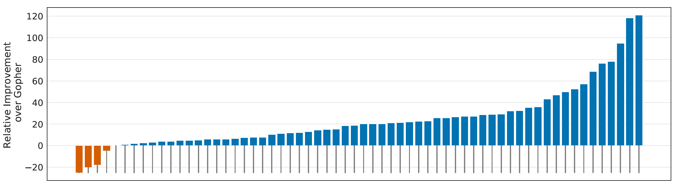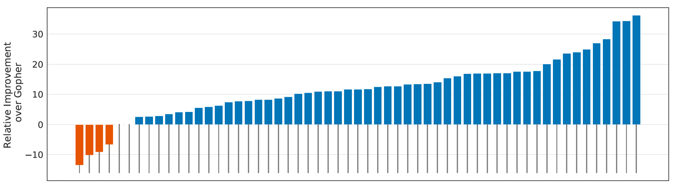 BIG-bench 데이터셋에서는 4개의 task를 제외한 나머지에서 Chinchilla가 훨씬 뛰어난 성능을 보였다.