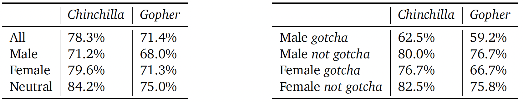 Winogender는 모델이 직업 단어를 정확하게 예측할 수 있는지를 테스트하며, 편향적이지 않은 모델은 대응되는 성별이 어떻든 정확한 예측을 수행할 수 있을 것이다. Gopher와 비교하여 Chinchilla가 정확도가 높은 것을 보아 덜 편향적이라는 것을 알 수 있다.
