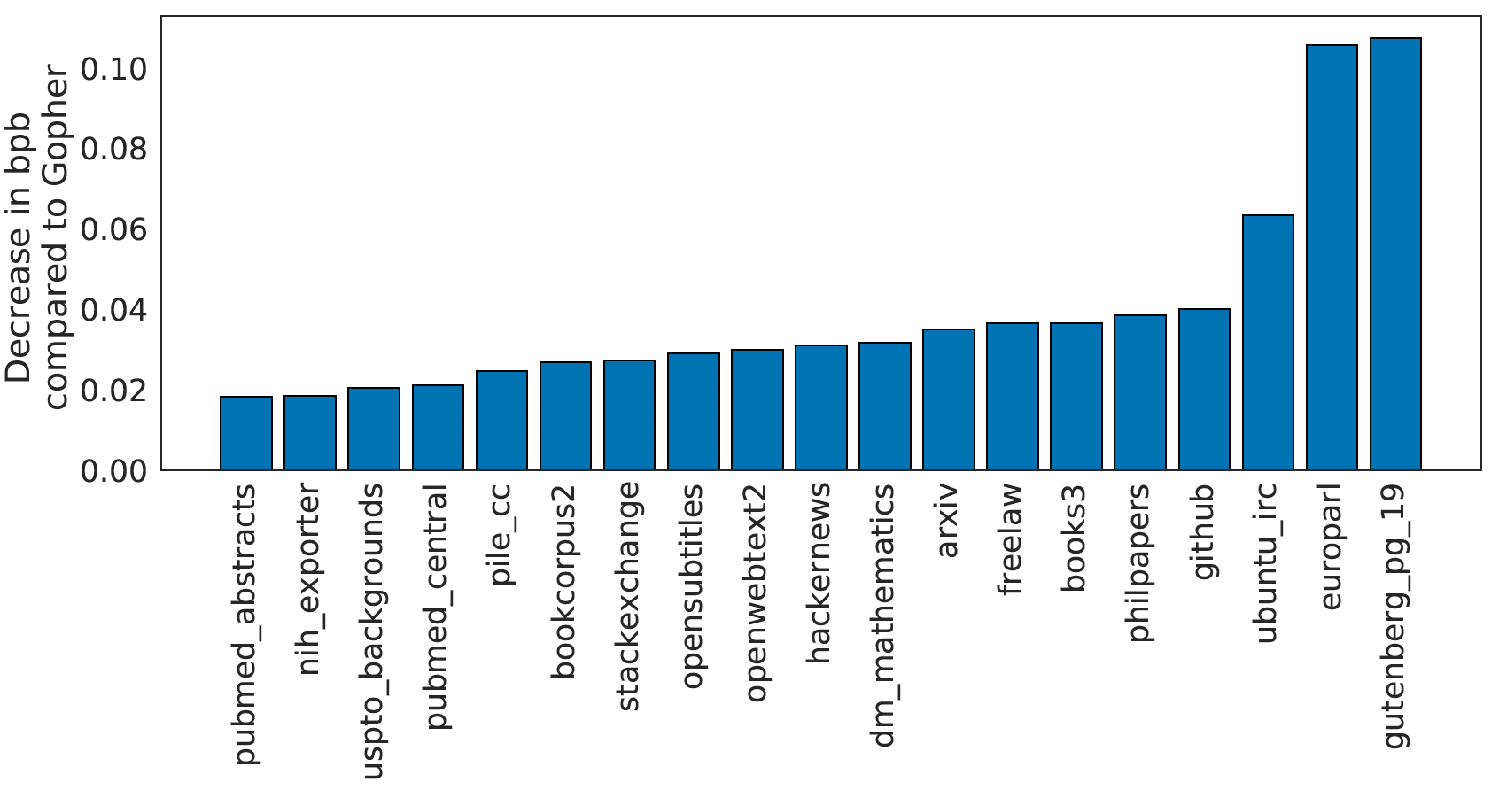 위 그래프는 The Pile이라는 평가 데이터셋에 대한 결과를 Gopher와 비교한 결과이며, 모든 subset에 대해 Chinchilla가 우수한 결과를 보였다. Jurassic-1(178B)와 비교했을 때는 2개의 task를 제외한 모든 subset에서 Chinchilla가 우수했다.