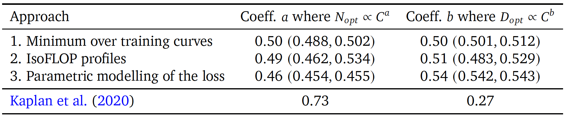 위의 표는 각 approach에서 계산된 $a$와 $b$를 보여준다. 기존의 scaling-law와는 확연한 차이가 있는 것을 볼 수 있다. Approach 1에 따라 파라미터의 수와 학습 토큰의 수를 동등한 비율로 scaling 한다고 했을 때, 최적의 컴퓨팅 예산의 할당은 다음과 같다.