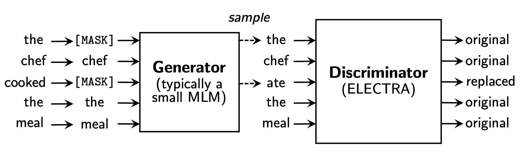 $$\min_{\theta_G, \theta_D} \sum_{x \in X} L_{MLM}(x, \theta_G) + \lambda L_{Disc}(x, \theta_D)$$