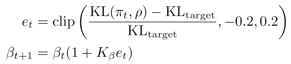 Fine-tuning은 PPO 기법이 사용되었다. 다른 seed와 같은 KL 패널티로 학습된 모델은 때때로 $KL(\pi, p)$의 값이 매우 다르게 나타나기 때문에 비교하기 어려워진다. 이를 해결하기 위해 일부 실험에서는 $\beta$를 log-space proportional controller를 활용하여 동적으로 변화시켜 특정 $KL(\pi, p)$값을 도출한다. $K_{\beta} = 0.1$로 고정되며, 아래와 같이 KL 패널티를 세팅한다.