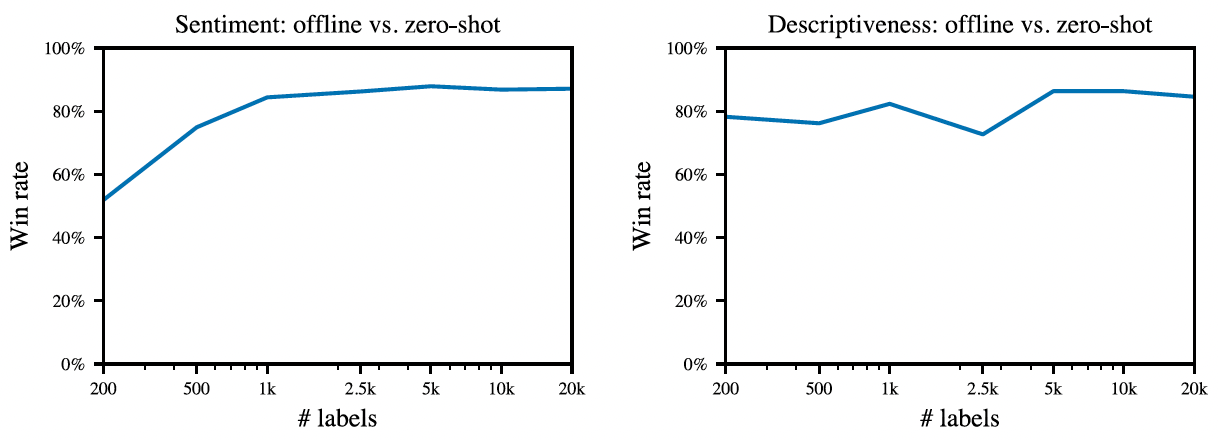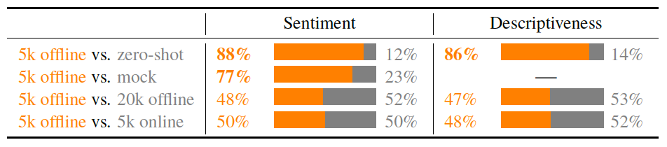 위는 zero-shot과 5k offline 모델의 descriptive continuation 예시이다. Zero-shot과 비교하여 5k offline 모델은 소설처럼 생생한 구절을 생성할 수 있게 된다.