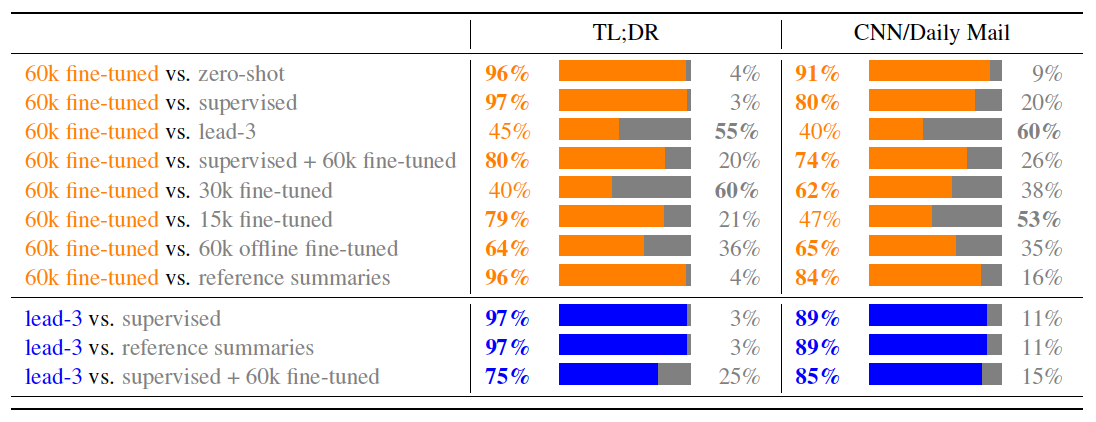 위 그래프는 RL fine-tuning 모델이 zero-shot 모델과 비교하여 얼마나 선호되었는지를 나타낸다. 대부분의 경우에서 fine-tuned 모델이 zero-shot 모델보다 선호도가 월등히 높았다.