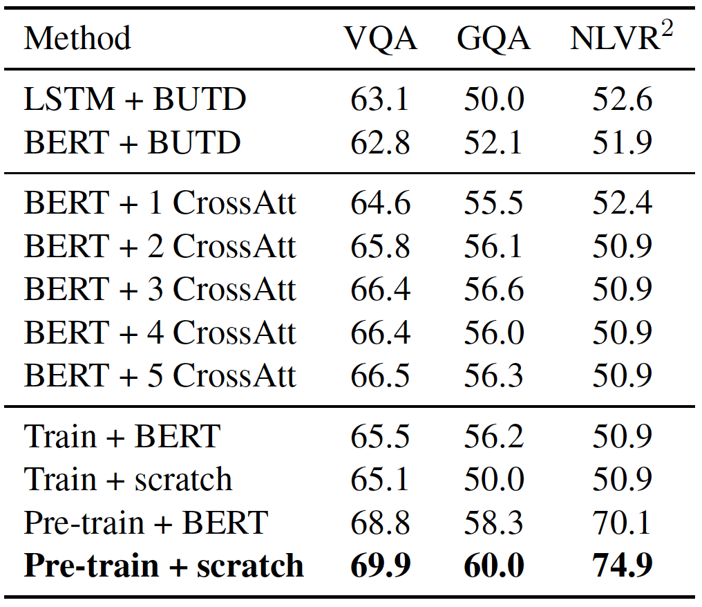 Pre-train + BERT라고 되어있는 모델은 BERT의 pre-trained 파라미터를 LXMERT에 불러와 pre-training을 진행한 방식으로 오히려 악영향을 미치는 것을 볼 수 있으며, 이에 따라 LXMERT는 BERT의 파라미터를 불러오지 않고 처음부터 pre-training을 진행한다.