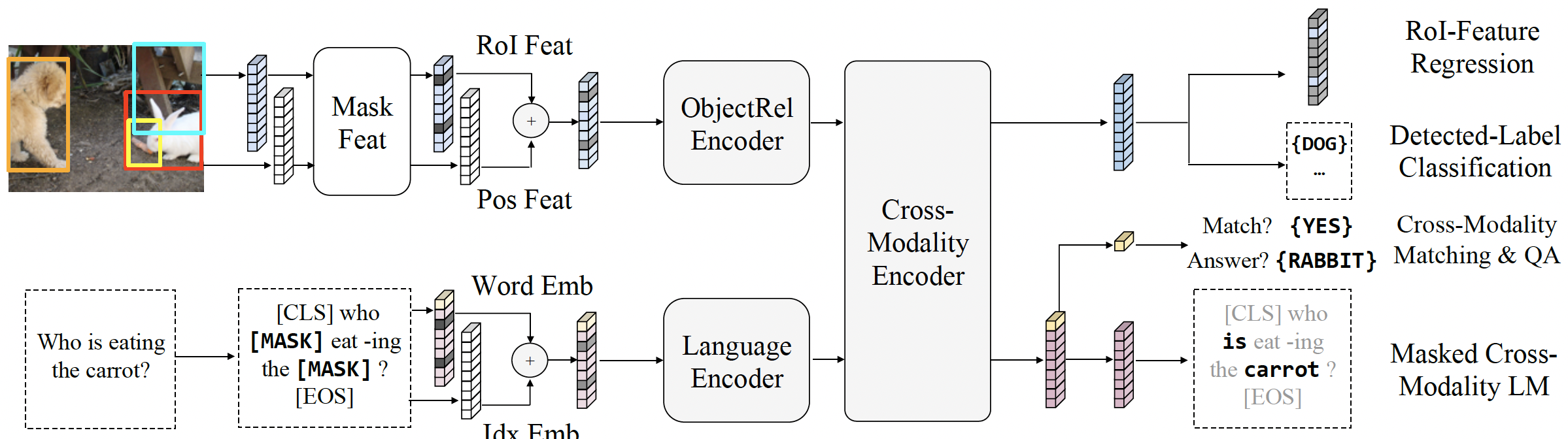 [그림 2]의 오른쪽 윗부분을 보면 object masking을 통해 두 개의 vision task를 수행하는 것을 볼 수 있다. Language task에서처럼 모델은 vision/language feature를 모두 활용하여 예측을 수행한다. Object feature를 활용하는 것은 object-relationship을 파악하는데 도움을 줄 것이고, language feature를 활용함으로써 모델은 cross-modality alignment를 학습할 수 있게 된다. Vision task는 RoI-feature Regression과 Detected Label Classification sub-tasks로 이뤄져 있다.