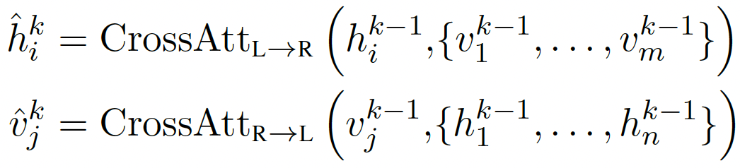 [그림 1]를 보면 cross-modality encoder는 "Cross"로 나타난 cross-attention과 self-attention, 그리고 feed-forward sub-layers로 이뤄져 있다. k-번째 레이어에서 계산을 위해 사용되는 query와 context vector는 이전 (k-1)번째 레이어의 출력이며, language feature $\{h_i^{k-1}\}$와 vision feature $\{v_j^{k-1}\}$이 입력으로 사용된다.