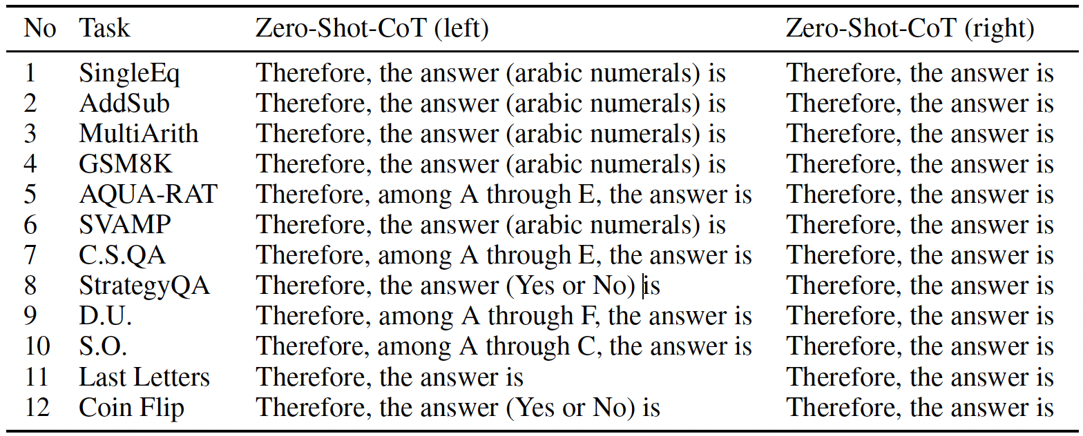Zero-shot CoT와 zero-shot의 성능 비교표는 아래에서 확인할 수 있다.