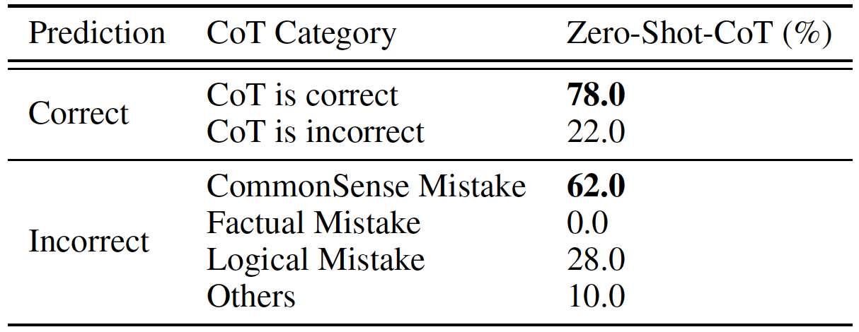 논문에서는 zero-shot CoT의 추가적인 이해를 위해 모델이 틀린 답을 내놓았던 예시를 분석한다. 랜덤으로 틀린 추론 예시를 추출해 관찰한 결과, commonsense reasoning task에서는 최종 답이 틀리더라도 대체로 중간 논리는 유연하고 논리적이었으며, 종종 하나의 답변을 고르지 못해 여러 답변을 출력하기도 했다. Arithmetic task에서는 모델이 추론 과정 중에 정답을 언급하지만, 불필요한 추가 계산을 해서 오답을 출력하는 경우가 많이 있었으며, 때론 추론을 시작하지 않고 입력 문장을 계속 반복 출력하기도 했다.