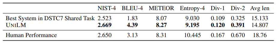 Response generation은 서로 주고받는 대화와 정보 source로 web document가 주어지며, 모델은 대화에 이어지는 답변을 출력해야 하는 task이다. UniLM은 best DSTC7 모델의 성능을 넘어서며 SOTA를 달성한다.