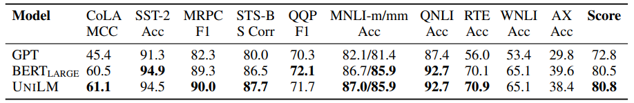 UniLM은 언급된 unidirectional LM, bidirectional LM, 그리고 sequence to sequence LM을 pre-training 과정에서 모두 학습하여 NLU와 NLG에서 모두 좋은 성능을 보인다. 다음 표를 확인하자.