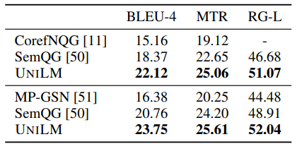 Passage와 answer span이 입력으로 주어졌을 때, 모델은 answer를 묻는 question을 출력해야 한다. UniLM은 이전 모델의 성능을 앞섰으며, question generation task의 SOTA를 달성했다.