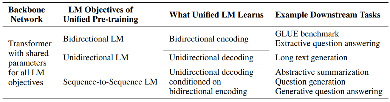 1. 여러 가지 모델링 기법을 통합한 pre-training은 cloze task를 통해 objective를 정의함으로써 여러 네트워크를 구현할 필요가 없다.