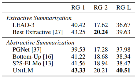 Text summarization은 입력 텍스트의 주요 정보를 간결하고 자연스럽게 요약하는 task이다. UniLM은 이전의 abstractive system의 성능을 모두 뛰어넘으며 SOTA를 달성한다. 또한 best extractive model인 ROUGE-L을 0.88 포인트 차이로 우수한 성능을 가진다.