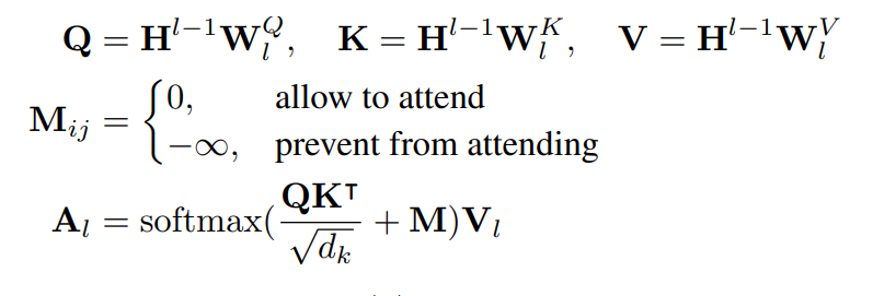 Backbone 네크워크는 위 수식에서처럼 multi-layer Transformer가 사용된다. $M_{i, j}$는 행과 열의 크기가 입력의 길이로 구성된 mask matrix이다. $M$의 값이 0이면 마스킹되지 않고, $-\infty$이면 마스킹된다는 의미이다. $M$은 cloze task로 다양한 모델링 objective를 구현하는 것에 사용된다. 그림 1에서와 같이 모델링 기법에 따라 다른 마스킹을 적용함으로써 pre-training을 진행한다.