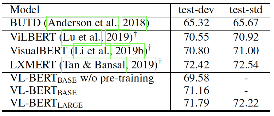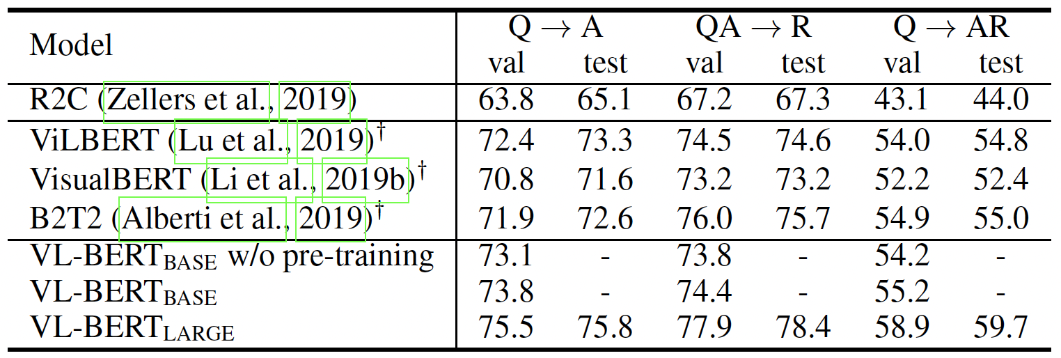 위의 그림은 VCR 벤치마크에서 다른 baseline 모델들과 성능을 평가한 결과이다. VL-BERT 모델은 다른 BERT 기반의 모델들을 outperform하는 성능을 보여주며, SOTA를 달성한다.