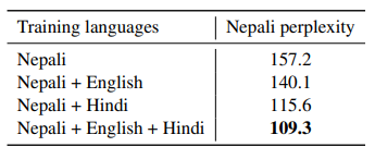 이때, 네팔어만으로 학습되었을 때보다, 영어와 힌디어를 종합적으로 학습시켰을 때, 네팔어에 대한 perplexity가 현저히 줄어든다. 힌디어와 영어의 데이터를 활용하여 네팔어에 대한 이해 능력을 향상했기 때문에 이와 같은 결과가 나온 것이다.
