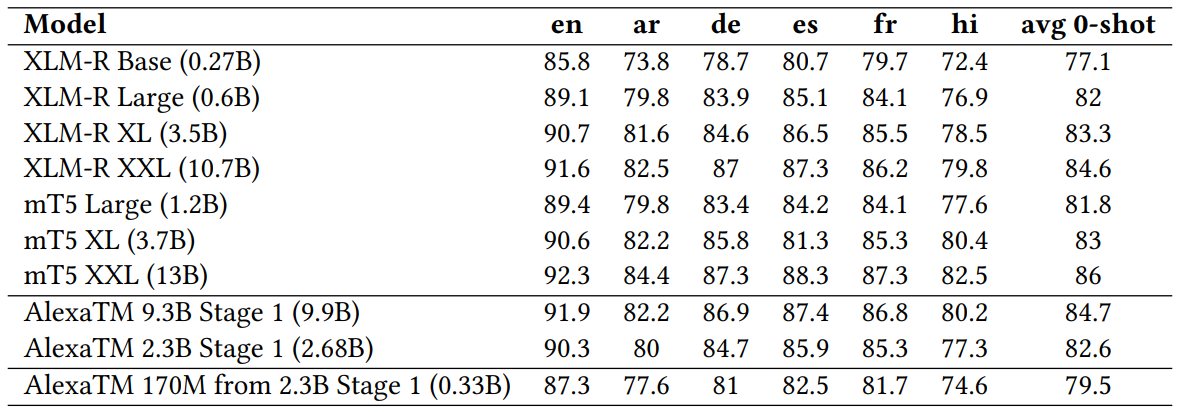 다음 그림는 baseline과 모델의 사이즈별 성능표이다. XNLI 데이터셋에 대하여 fine-tuning 후 성능을 측정한 수치를 나타내었다.