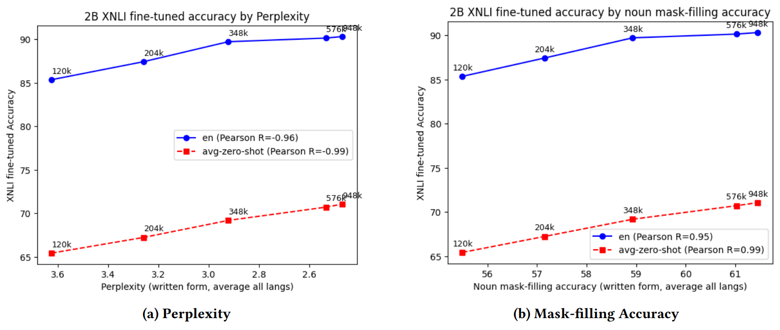 먼저 모델을 perplexity와 mask-filling 정확도에 대해 평가한다. Mask-filling은 Stanza tagger로 마스킹된 noun 형태의 subword token을 예측하는 task로 정의하였다. 아래 그래프를 확인하면 2.3B 크기의 모델이 영어에 대해서는 인간 정확도에 근접한 성능을 수행하는 것을 볼 수 있다.