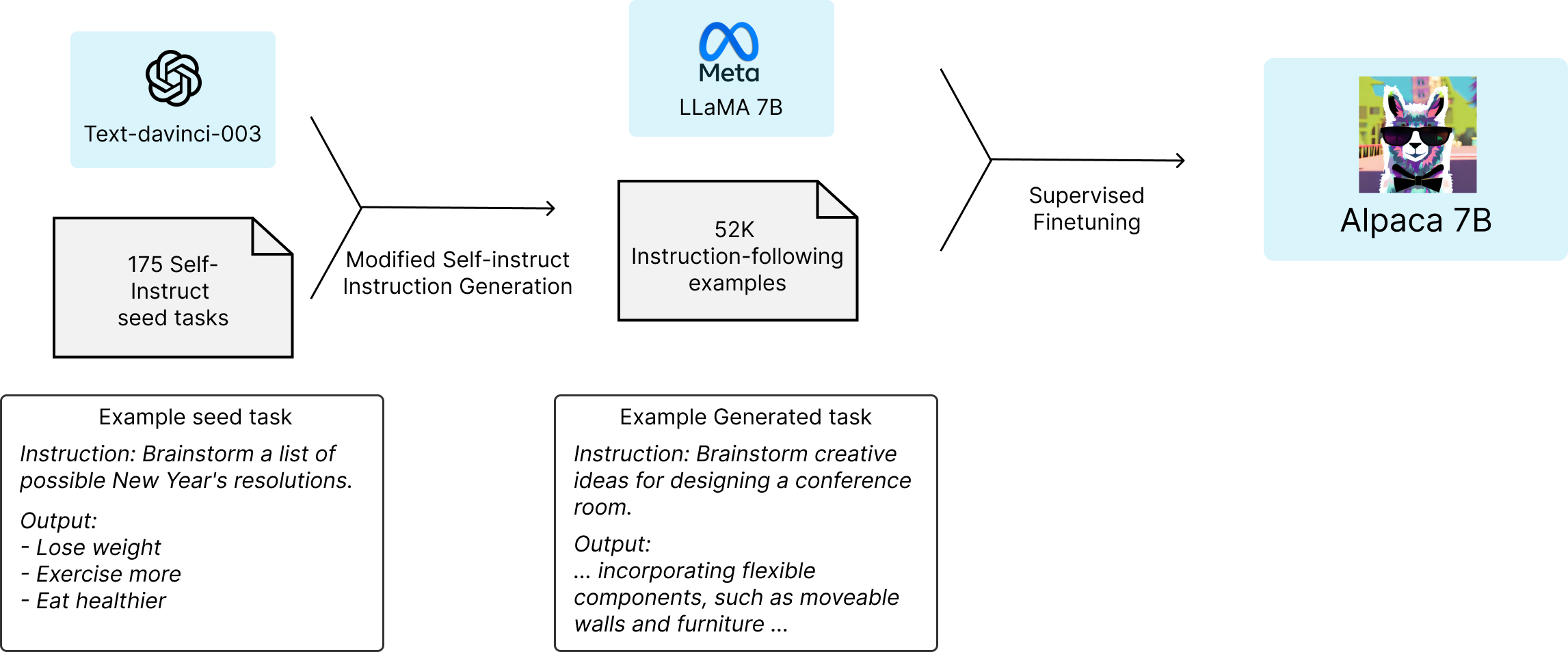첫번째 조건은 Meta의 LLaMA 모델을 사용함으로써 해결된다. 두번째 문제는 수동적인 instruction data 생성으로는 해결하기 어렵다. Self-instruct 논문에서 소개된 method를 사용하면 이를 해결할 수 있으며, OpenAI에서 공개한 text-davinci-003을 사용해서 고품질 instruction data를 생성하여 사용한다. Instruction data는 52K개의 label을 포함하고 있으며, 최종적으로 LLaMA 7B 모델로 fine-tuning 과정을 거치면 Alpaca 모델이 된다.