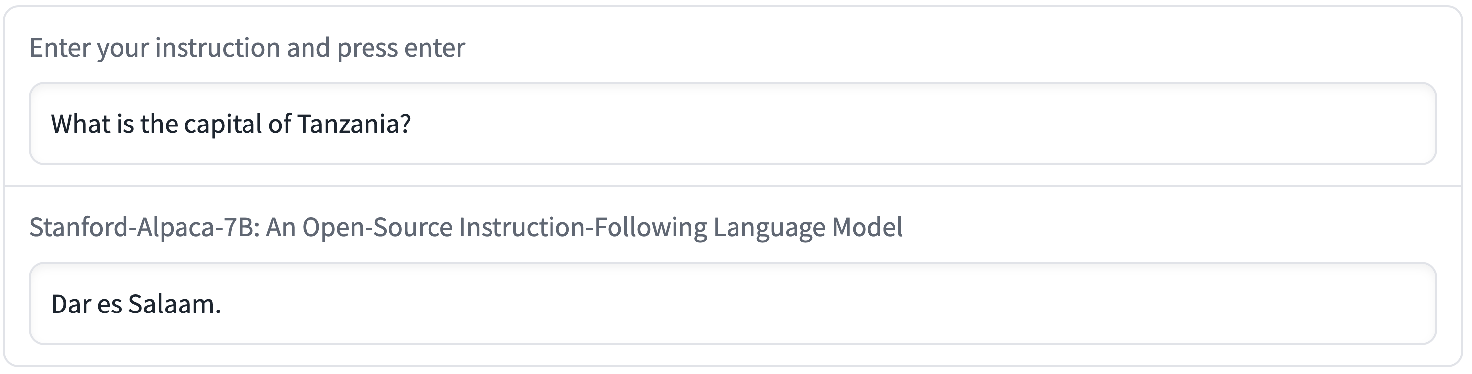 Alpaca 모델의 hallucination, toxicity, 그리고 stereotype와 같은 문제점은 해결되지 않았다. 특히 hallucination은 text-davinci-003과 비교해도 더 많이 발생했다고 한다. 다음의 예시를 보자.