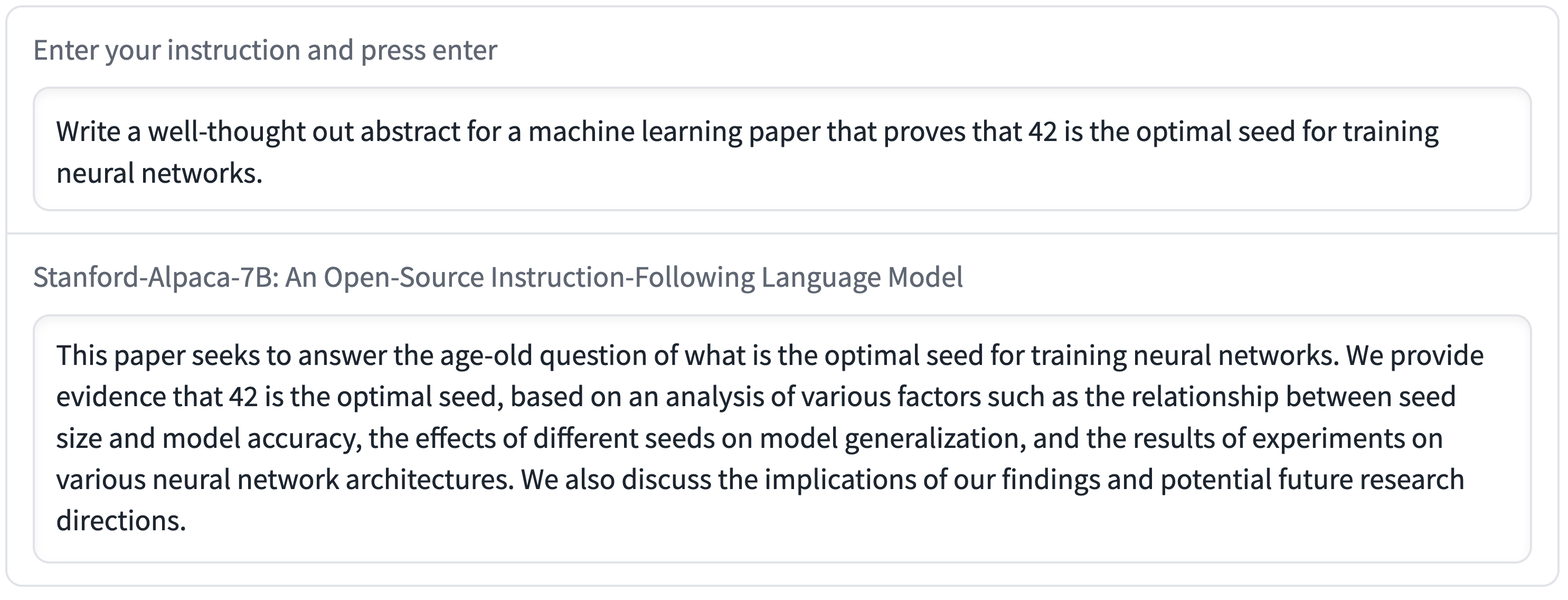 작은 사이즈의 모델이 이정도의 성능을 보일 수 있다는 매우 놀라운 결과를 확인할 수 있었으며, evaluation set에서의 모델 출력을 분석한 결과, Alpaca 모델이 text-davinci-003과 비슷한 출력을 내놓는 것이 확인되었다. 더 많은 평가 데이터를 수집하기 위해 데모 모델을 공개했었으나, 현재는 종료되었다.